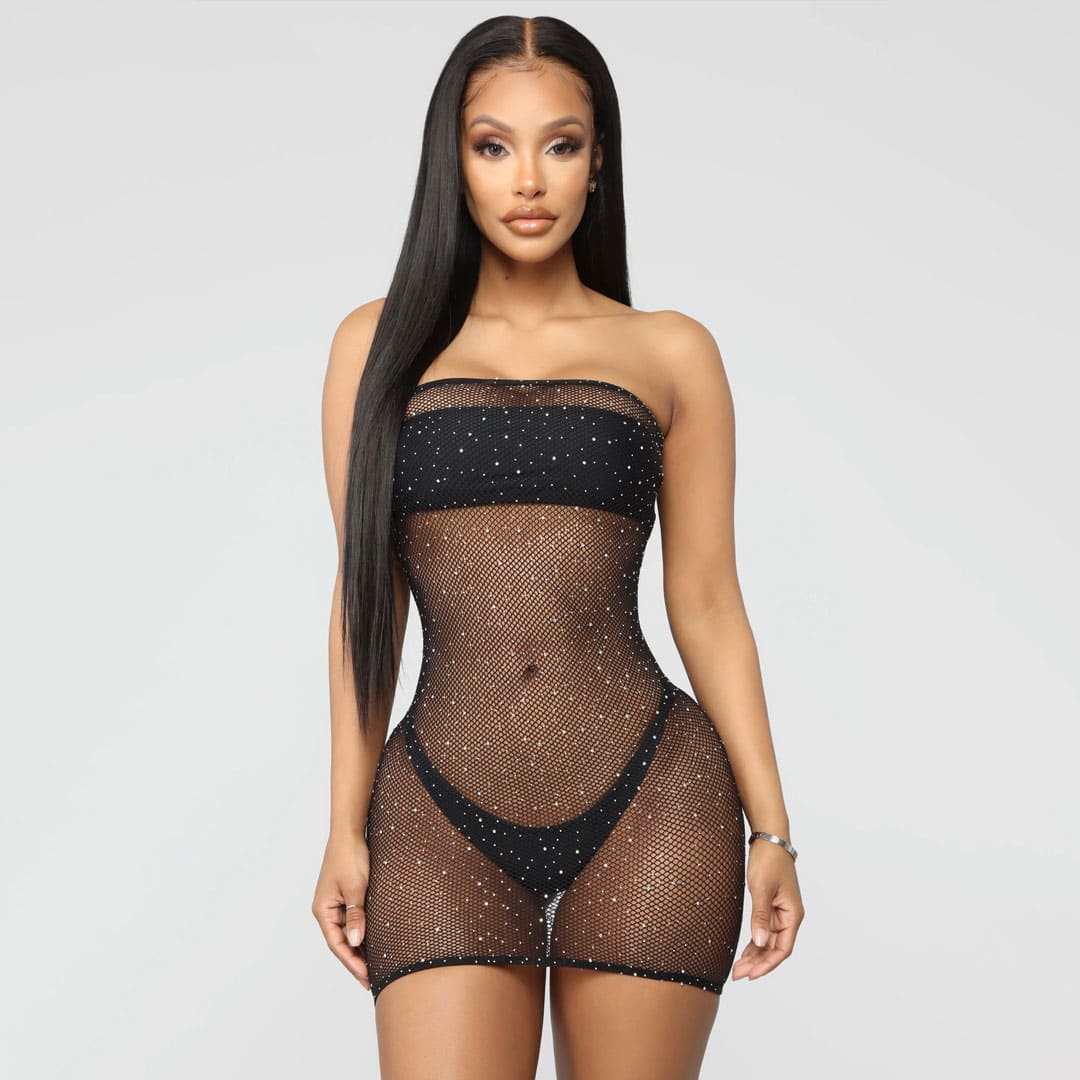 ¡Atrévete a brillar! ✨ Este vestido negro transparente con diamantes de imitación es perfecto como lencería o para crear outfits únicos y seductores. Ideal para lucir sexy y con estilo. 💃